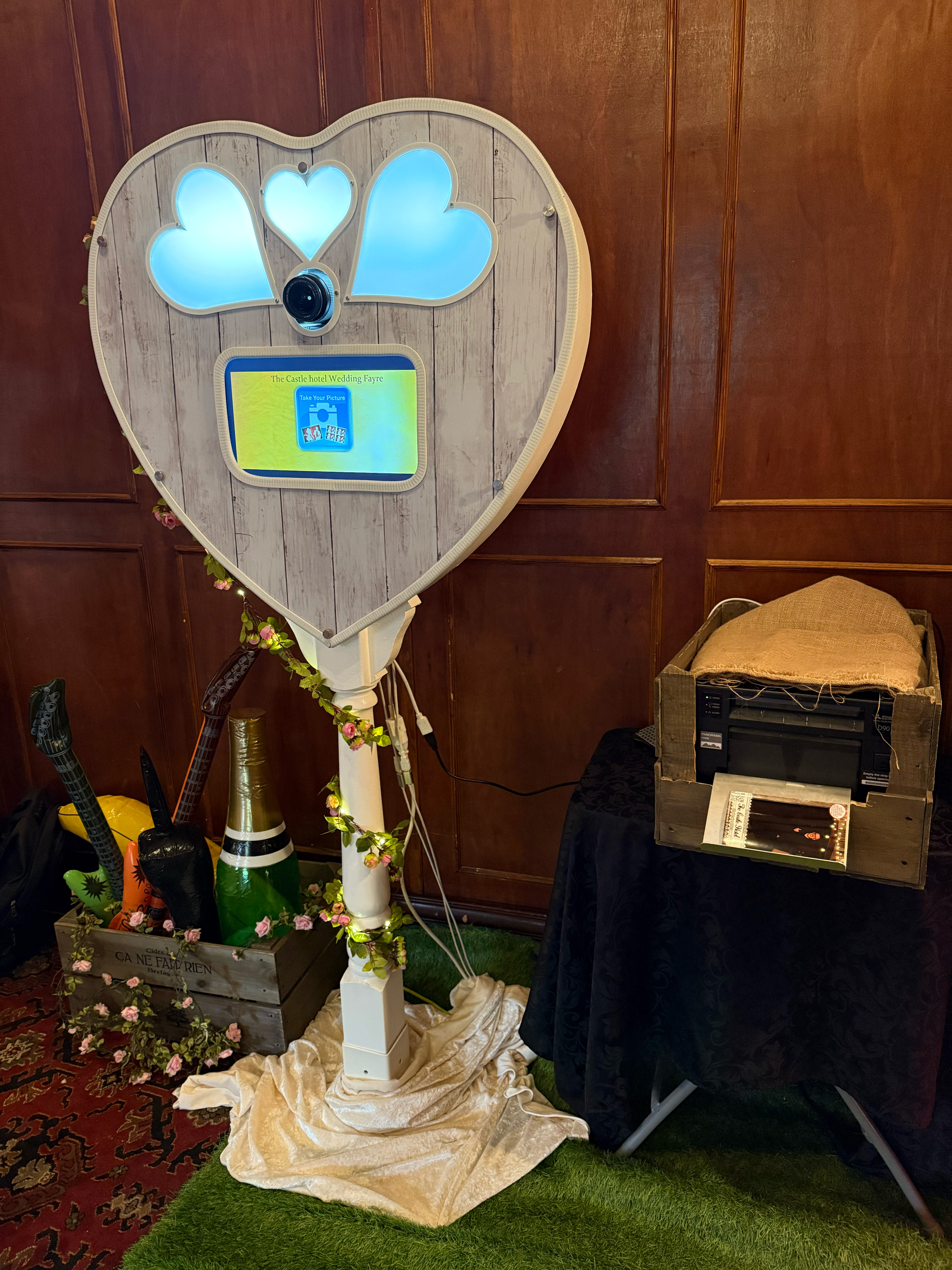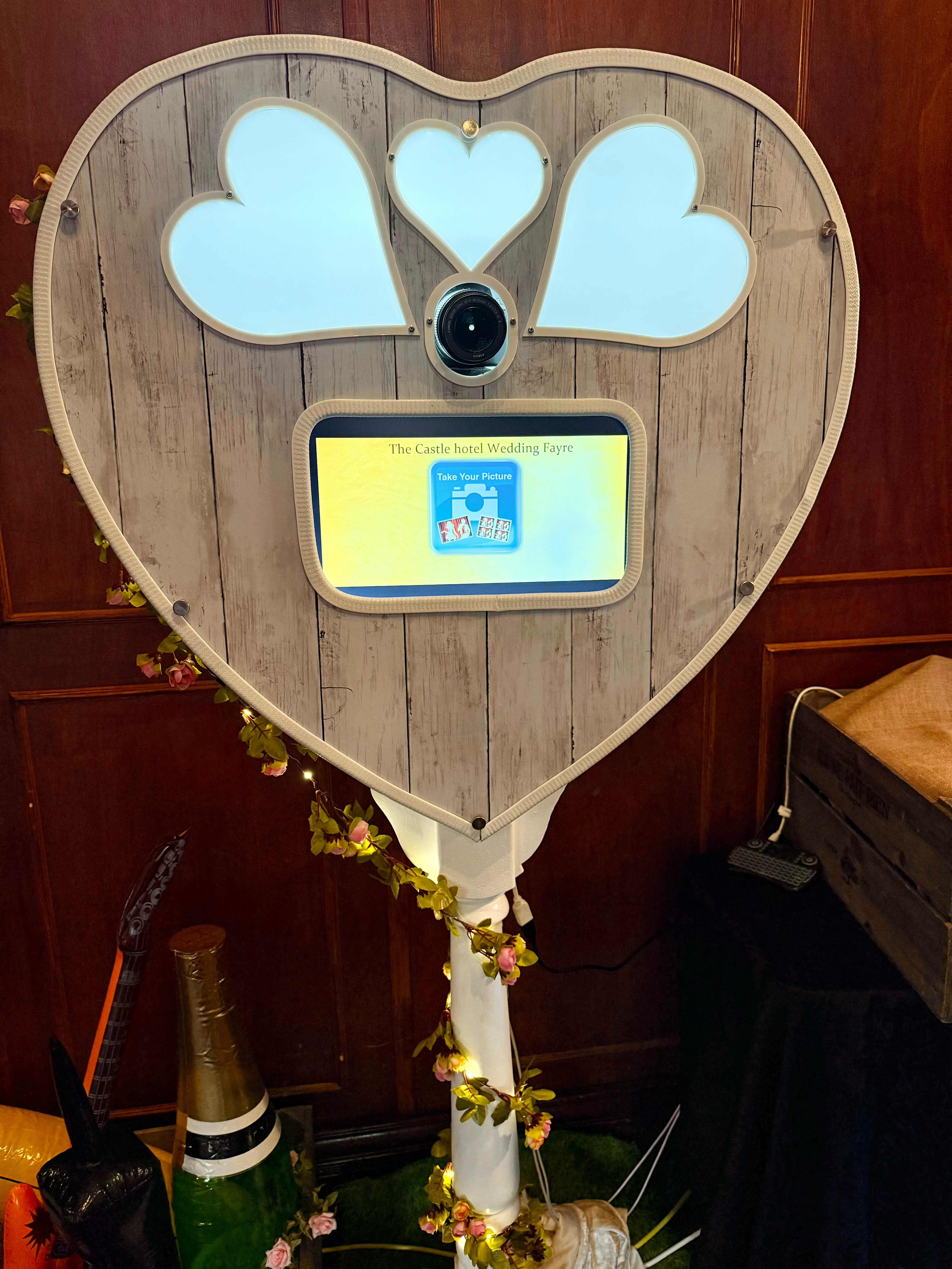 The Heart design and the led light up flowers that wrap around the stem look classy and blend easily into new venues as well as rustic style venues, to complement the rustic look we also place our printer in an apple style crate with the power bars and lcomputer cleverly hidden. The unique design makes the whole photobooth an excellent centrepiece for any special occasion especially weddings.It allows you to create great fun memories that guests are able to take home with them! Touch the screen and the Heart Booth will come to life in front of your very eyes! Its random responses, verbally and visually entices you and your guests into having a photo taken. So grab yourself a prop, strike a pose with your friends and touch the start button!. This concept works similar to a photobooth, the Heart Booth captures landscape photos using a DSLR camera and operated using a touch screen. Strike a pose then you can text and print your photo's, Your pictures are then printed in less than 10 seconds.